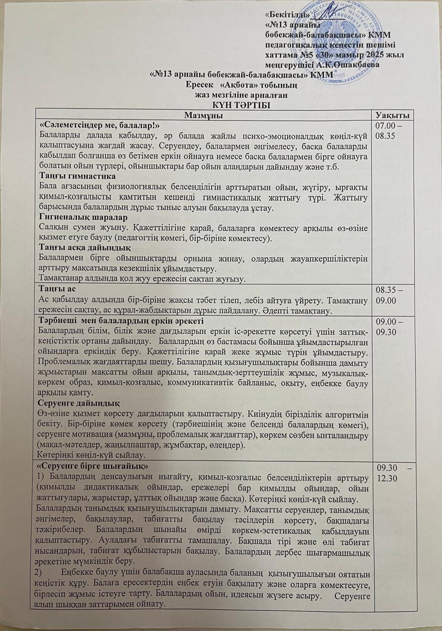Ересек "Ақбота" тобының жаз мезгіліне арналған кун тәртібі