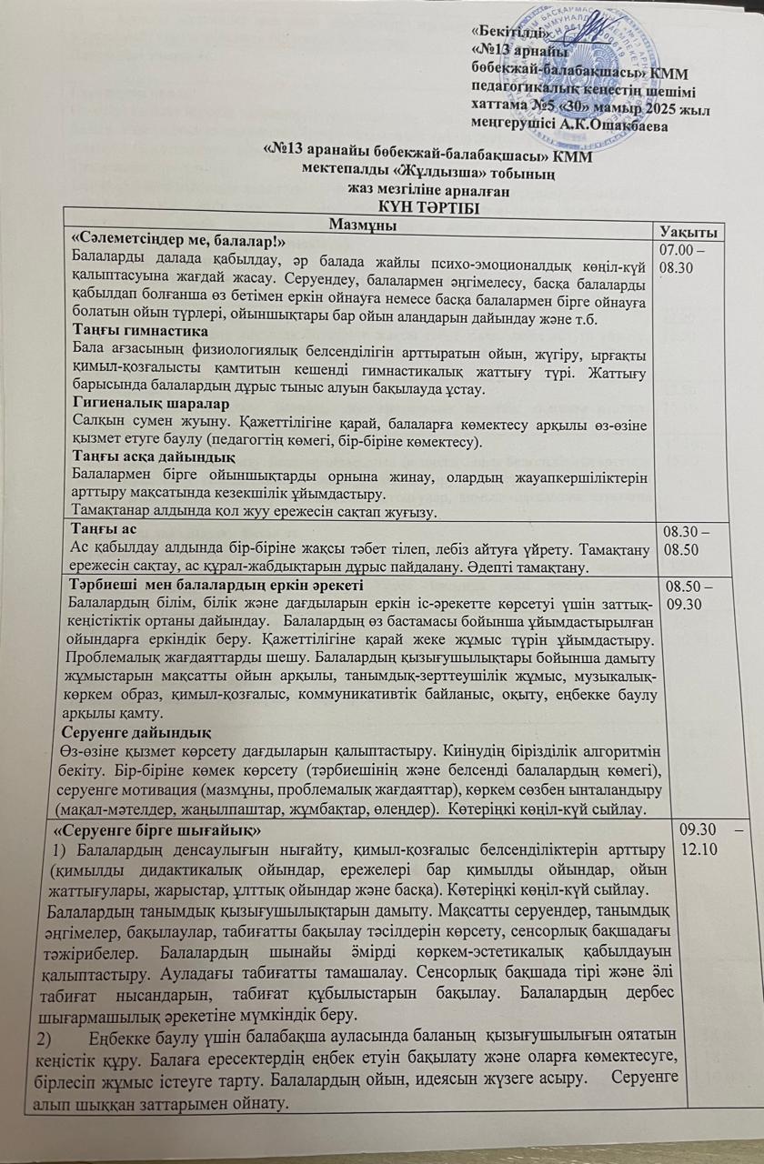 » Мектепалды "Жұлдызша" тобының жаз мезгіліне арналған күн тәртібі